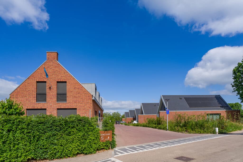 Daarnaast liggen aan het erf een 2-tal woningtypen die duidelijk verwijzen naar schuren en loodsen. Er zijn een 5-tal schuurwoningen en een 7-tal loodswoningen in het plan gesitueerd. De zogenaamde schuurwoningen hebben een goothoogte van ca. 3m en een nokhoogte van ca. 7m. Ze zijn als langwerpige massa’s aan de noordzijde van het erf gesitueerd. De verhouding lengte breedte is ca. 1:2 dat kenmerkend is voor een schuurwoning. De schuurwoningen zijn iets van de weg afgelegd en liggen terug ten opzichte van de boerderij. De schuurwoningen zijn richting de Bernsestraat ingetogen uitgevoerd en zo ontstaat een duidelijk contrast met de rijkere detaillering van de boerderij.