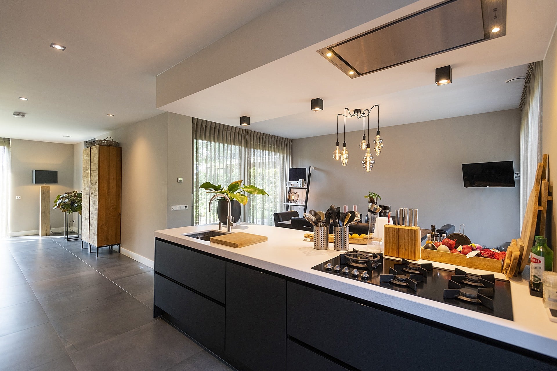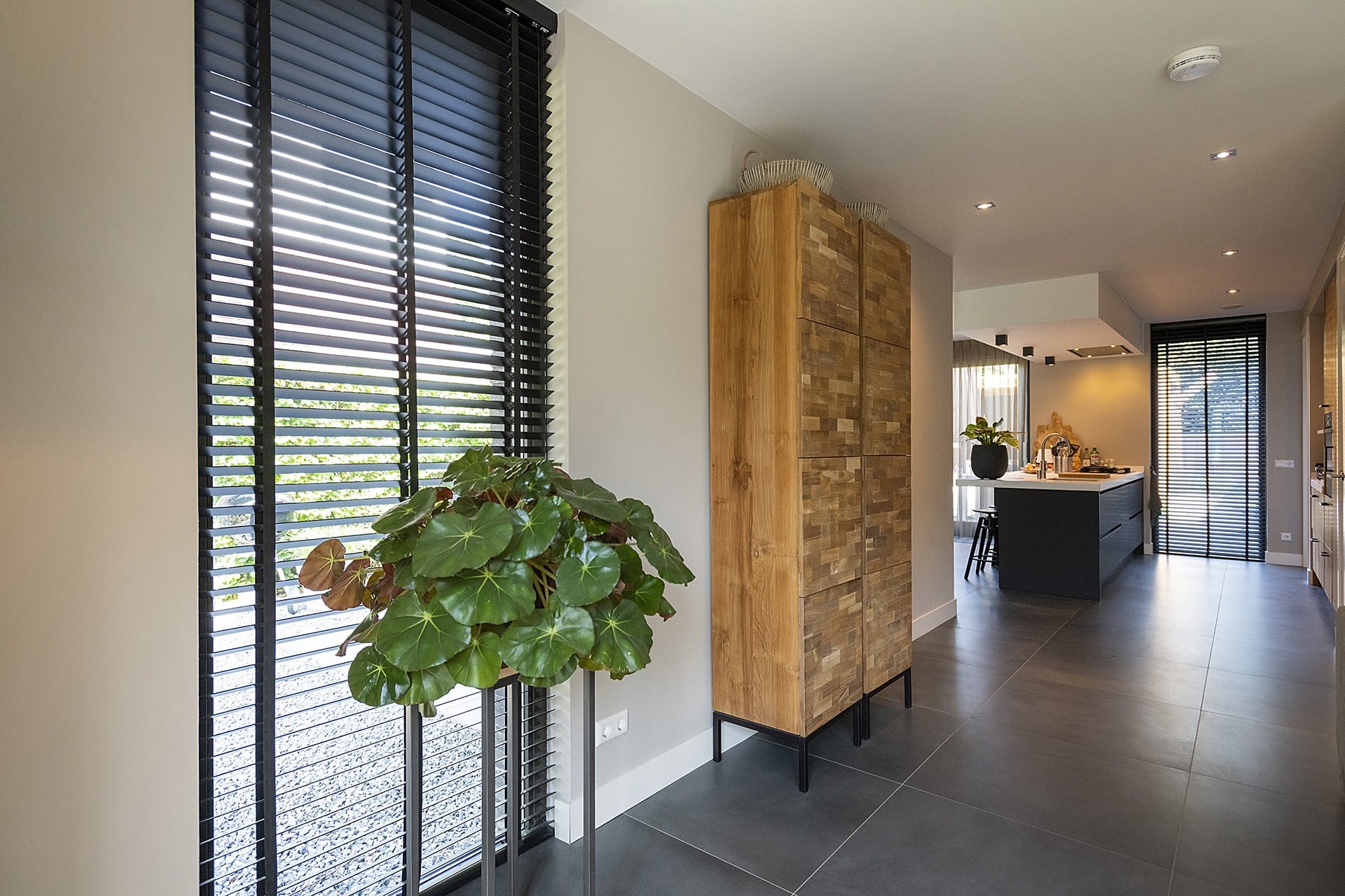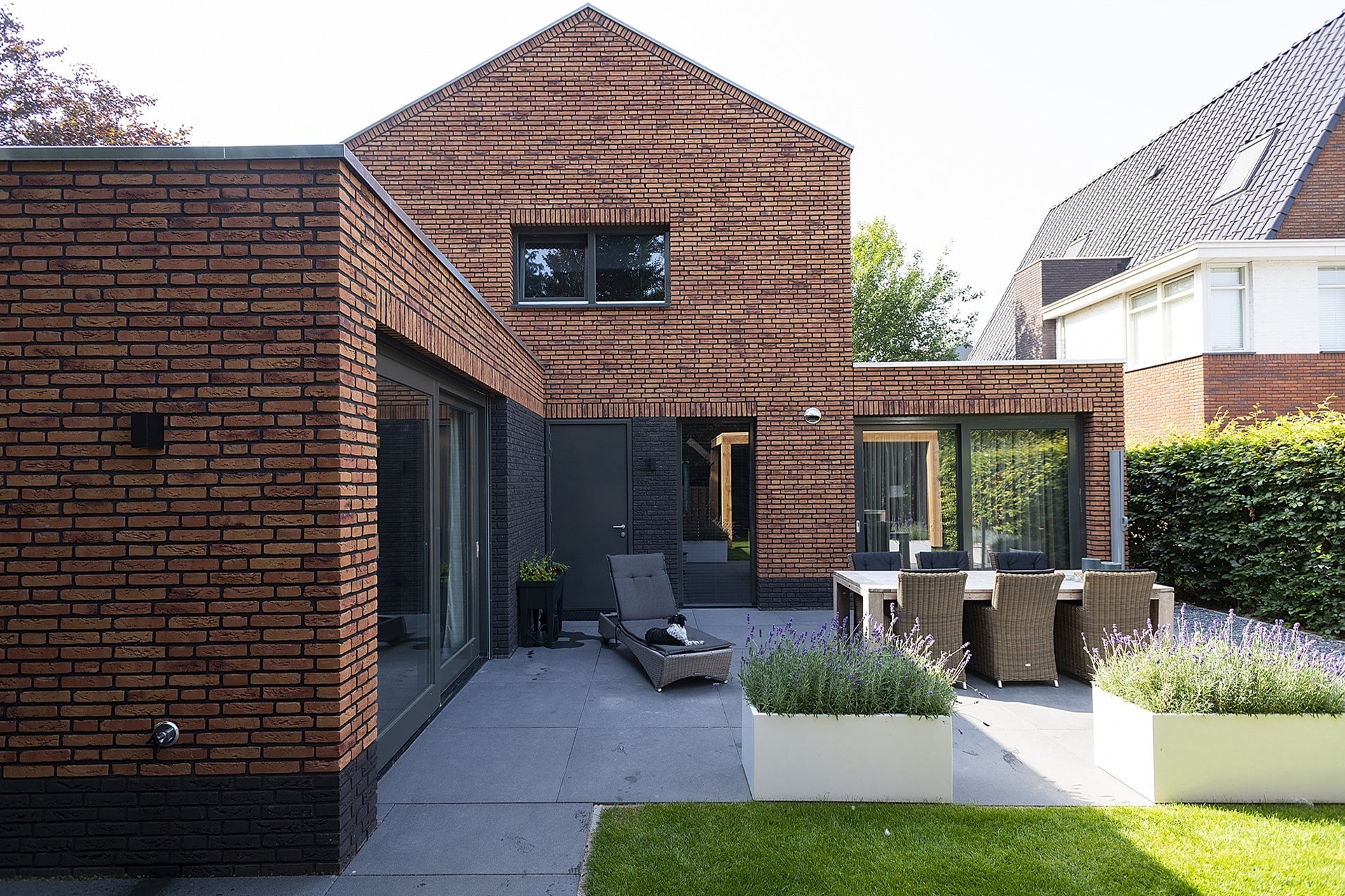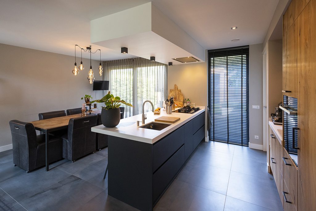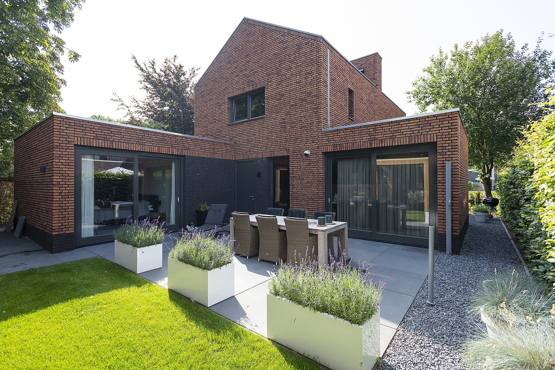In de opzet van de plattegrond is het met name van belang dat de woning een prettig leefklimaat heeft. Aangezien de voorgevel op het zuiden ligt hebben we de ruimtes zo gepositioneerd dat er toch optimaal gebruik gemaakt kan worden van de zon en het zicht op de tuin. Zo is de woning allereerst 3m naar voren geschoven om achter een grotere tuin de realiseren, maar zo ook een terras achterin de tuin te kunnen realiseren. Daarnaast is de eetkeuken in de westgevel uit de bouwmassa’s geschoven zodat deze zowel op de achtertuin als op de voorkant en zongericht is. Er zijn een tweetal terrassen aan de noord en zuidzijde gerealiseerd die naar wens te gebruiken zijn. Door een haag slim te positioneren is er nog voldoende uitzicht, maar toch een terras met privacy aan de zonzijde. Er moet ook opgemerkt worden dat het een doodlopende straat betreft en dit de laatste woning in het rijtje is.