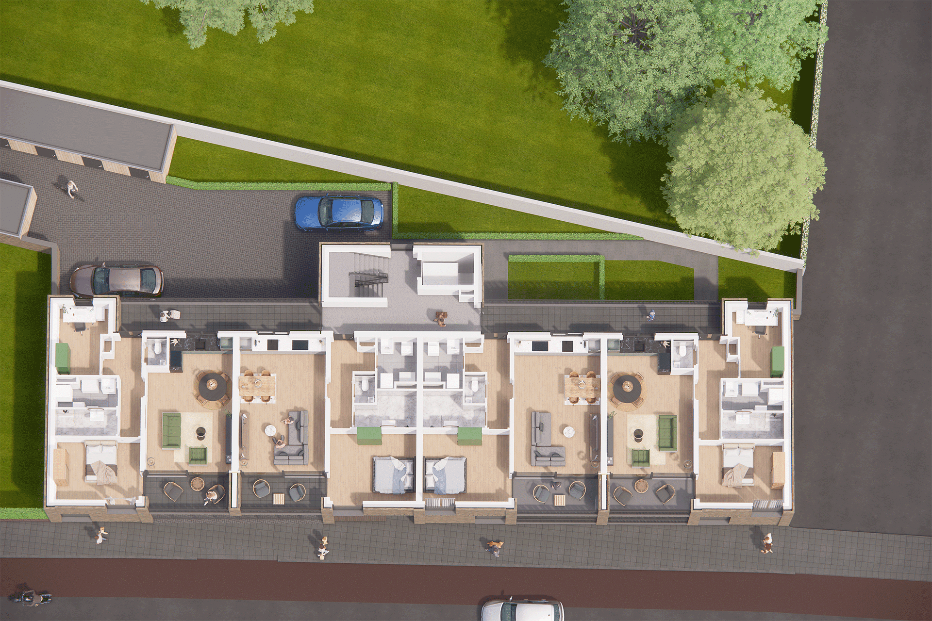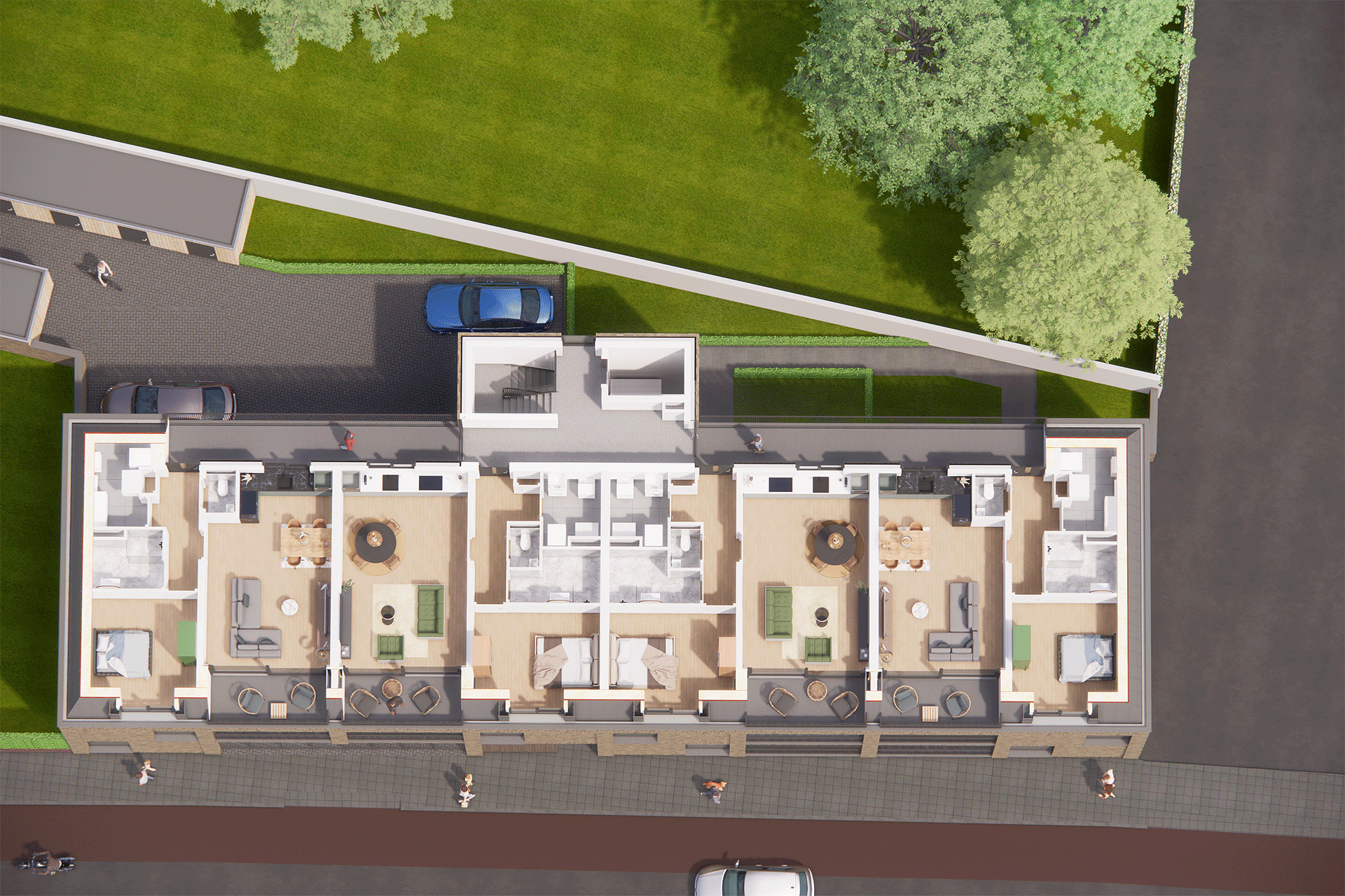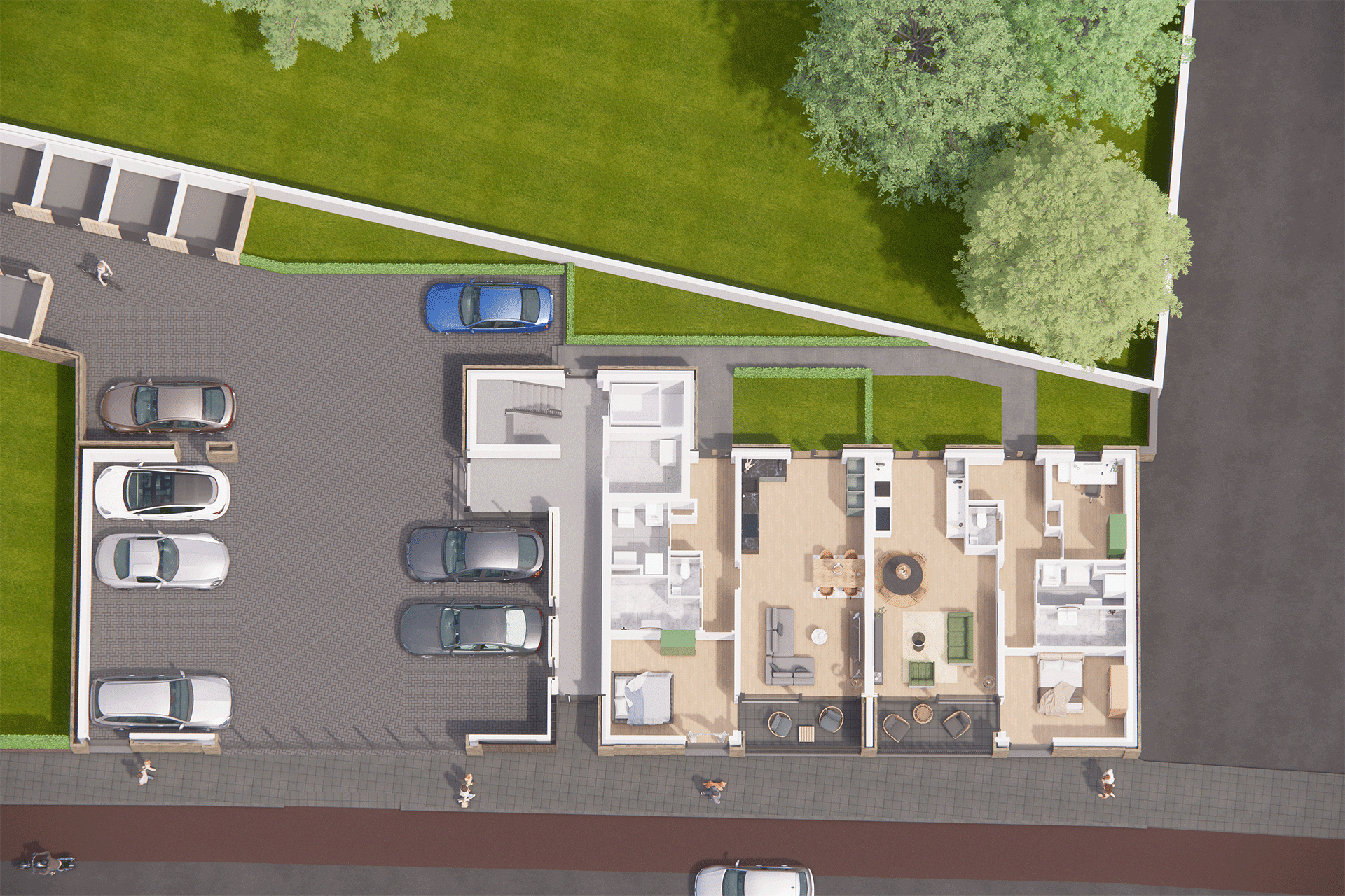 Op deze locatie worden een 10-tal appartementen gerealiseerd. De parkeerplaatsen dienen op eigen terrein te worden opgelost en daarom is ervoor gekozen om de het parkeren deels onder het gebouw te situeren. De woningen worden via de achterzijde ontsloten doormiddel van een galerij.