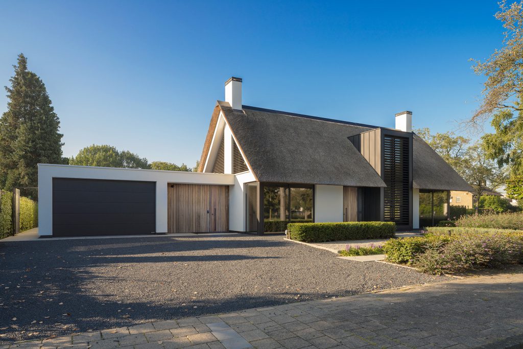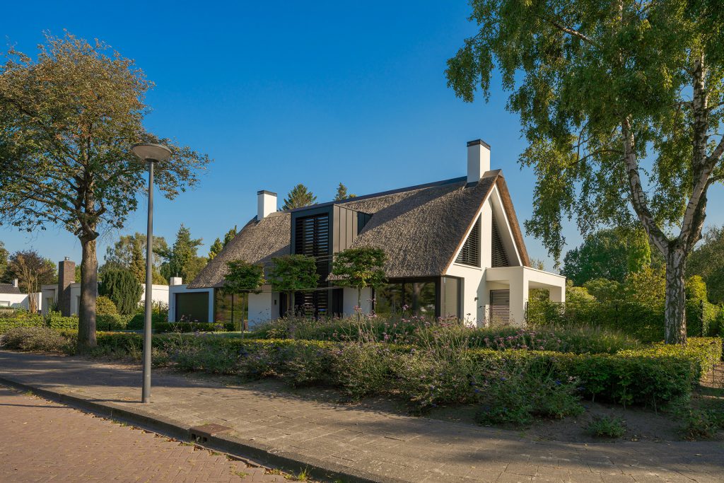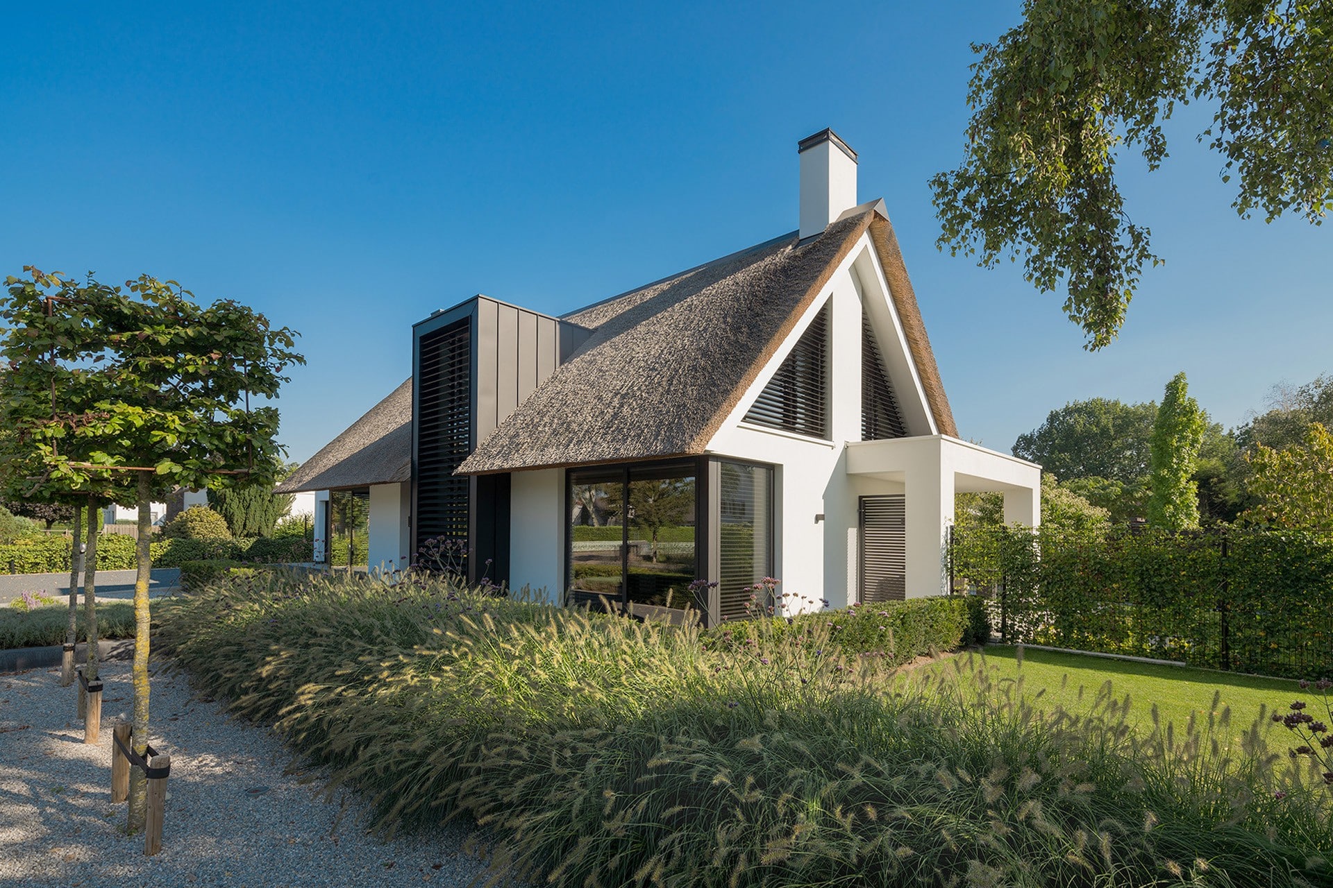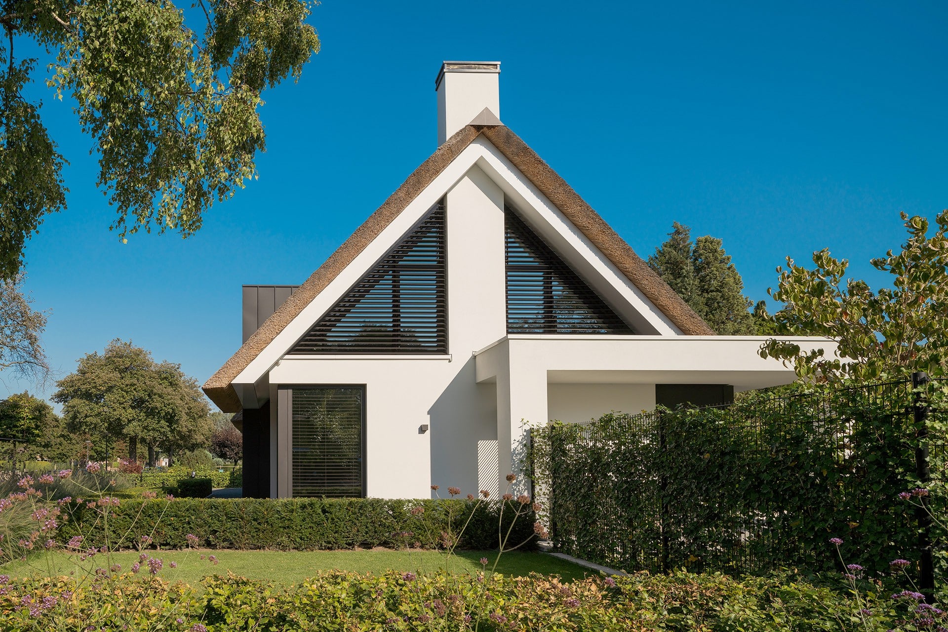 In een fraaie groene wijk achter het ziekenhuis in Waalwijk is deze villa gerealiseerd. Het is een bestaande wijk uit de Jaren 60 waar voornamelijk bungalows zijn gerealiseerd. Zo ook op dit perceel, waar de oorspronkelijk bungalow plaats moest maken voor deze villa. De villa ligt op een prominent hoekperceel en heeft aan de voorzijde een vrij uitzicht over een waterpartij en een klein parkje. De villa kenmerkt zich door een heldere witte basismassa dat uit wit gevelstucwerk is opgetrokken. Belangrijk is de verhouding in de grote vlakken van glas en hout die worden geleed door de witte penanten. En zo het gehele ensemble op de grond gezet. Hierdoor is de basis goed leesbaar en ondanks de schaal komt deze ingetogen over. De basismassa is afgedekt door een rieten kap. Aan de voorzijde springt vooral de zwarte erker eruit die plaats biedt aan het trappenhuis. De verticaal geplaatste zwarte erker vormt samen met de twee schoorstenen een fraai samenspel met de horizontale georiënteerde witte onderbouw en dak.