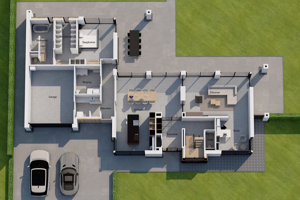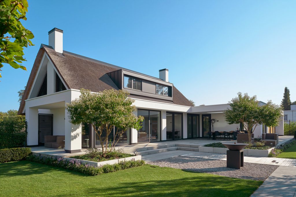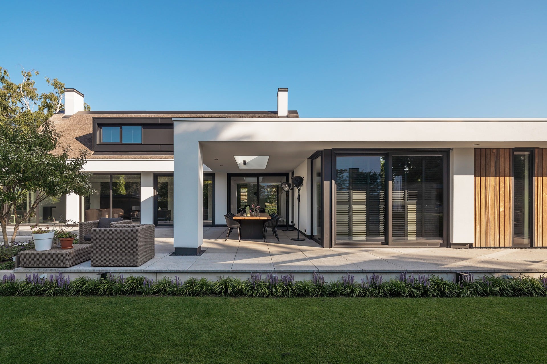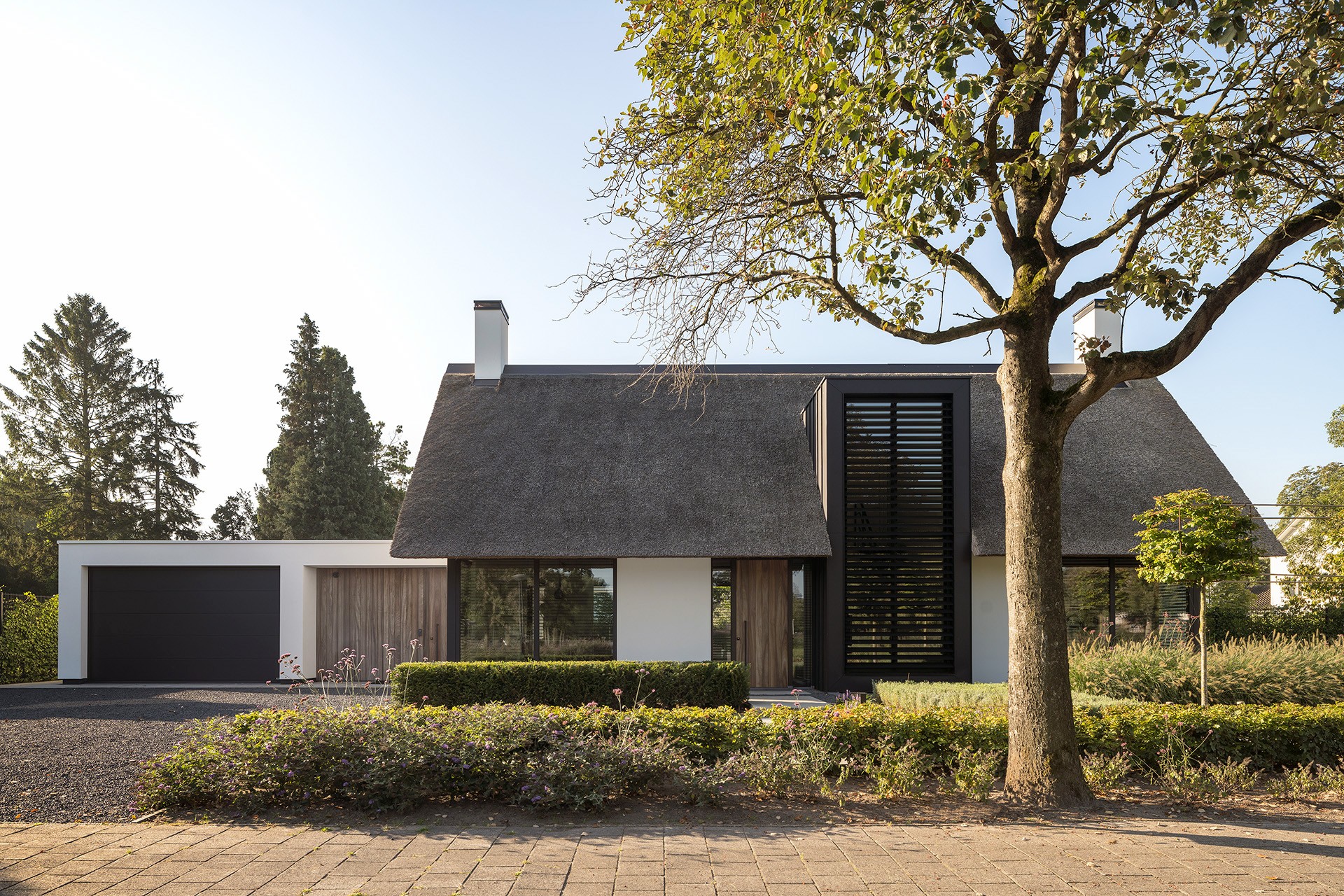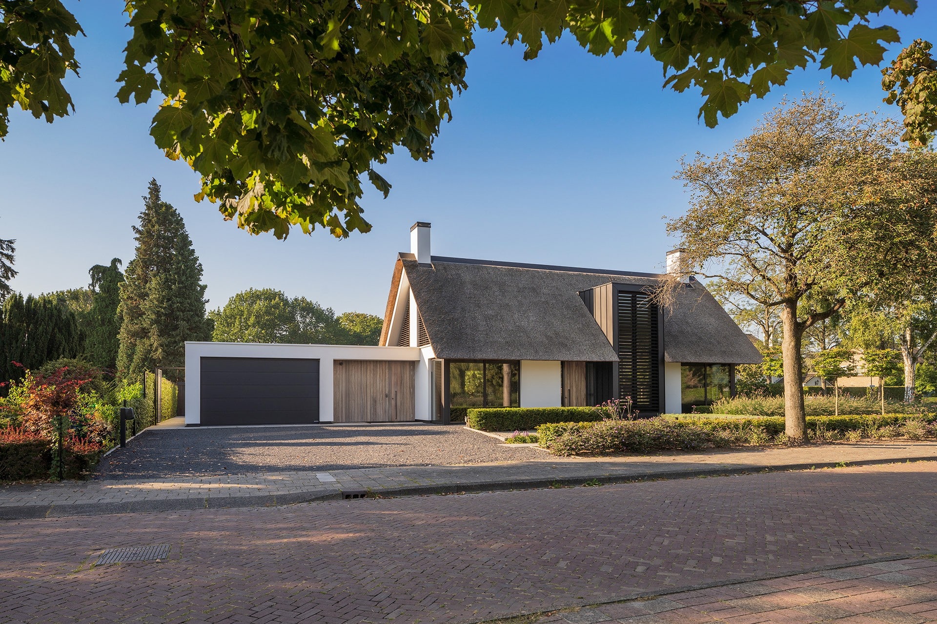 In een fraaie groene wijk achter het ziekenhuis in Waalwijk is deze villa gerealiseerd. Het is een bestaande wijk uit de Jaren 60 waar voornamelijk bungalows zijn gerealiseerd. Zo ook op dit perceel, waar de oorspronkelijk bungalow plaats moest maken voor deze villa. De villa ligt op een prominent hoekperceel en heeft aan de voorzijde een vrij uitzicht over een waterpartij en een klein parkje. De villa kenmerkt zich door een heldere witte basismassa dat uit wit gevelstucwerk is opgetrokken. Belangrijk is de verhouding in de grote vlakken van glas en hout die worden geleed door de witte penanten. En zo het gehele ensemble op de grond gezet. Hierdoor is de basis goed leesbaar en ondanks de schaal komt deze ingetogen over. De basismassa is afgedekt door een rieten kap. Aan de voorzijde springt vooral de zwarte erker eruit die plaats biedt aan het trappenhuis. De verticaal geplaatste zwarte erker vormt samen met de twee schoorstenen een fraai samenspel met de horizontale georiënteerde witte onderbouw en dak.