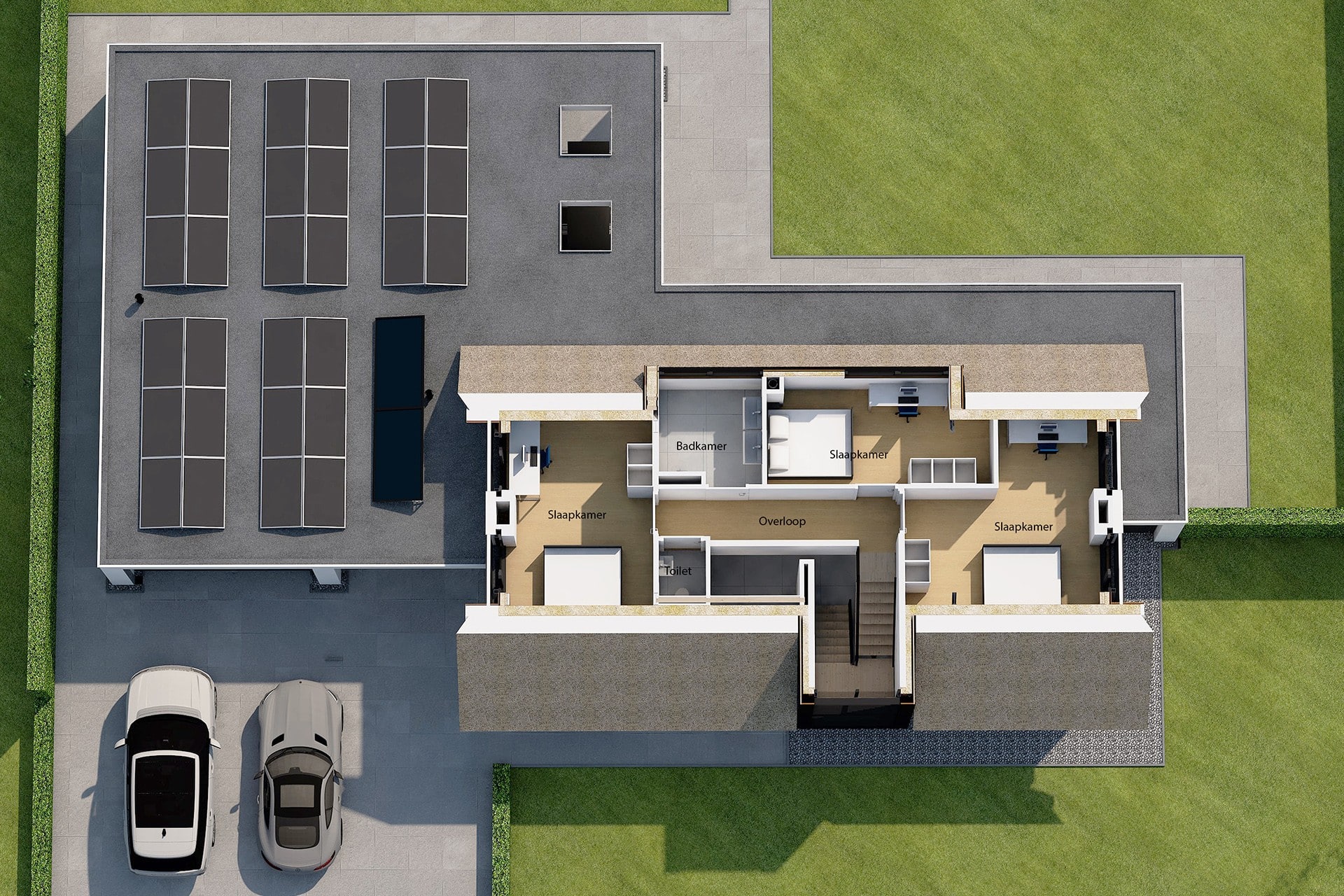 In een fraaie groene wijk achter het ziekenhuis in Waalwijk is deze villa gerealiseerd. Het is een bestaande wijk uit de Jaren 60 waar voornamelijk bungalows zijn gerealiseerd. Zo ook op dit perceel, waar de oorspronkelijk bungalow plaats moest maken voor deze villa. De villa ligt op een prominent hoekperceel en heeft aan de voorzijde een vrij uitzicht over een waterpartij en een klein parkje. De villa kenmerkt zich door een heldere witte basismassa dat uit wit gevelstucwerk is opgetrokken. Belangrijk is de verhouding in de grote vlakken van glas en hout die worden geleed door de witte penanten. En zo het gehele ensemble op de grond gezet. Hierdoor is de basis goed leesbaar en ondanks de schaal komt deze ingetogen over. De basismassa is afgedekt door een rieten kap. Aan de voorzijde springt vooral de zwarte erker eruit die plaats biedt aan het trappenhuis. De verticaal geplaatste zwarte erker vormt samen met de twee schoorstenen een fraai samenspel met de horizontale georiënteerde witte onderbouw en dak.
