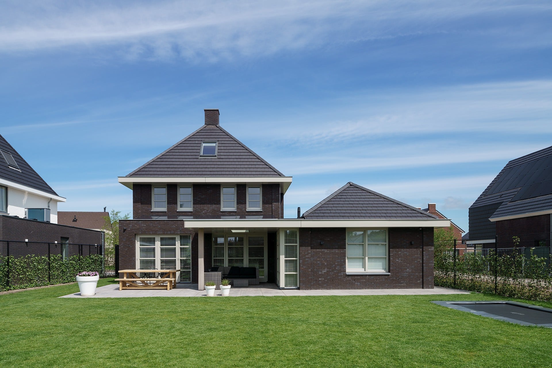 De donkere steen in combinatie met de lichte kozijnen en goten geven de woning een unieke uitstraling