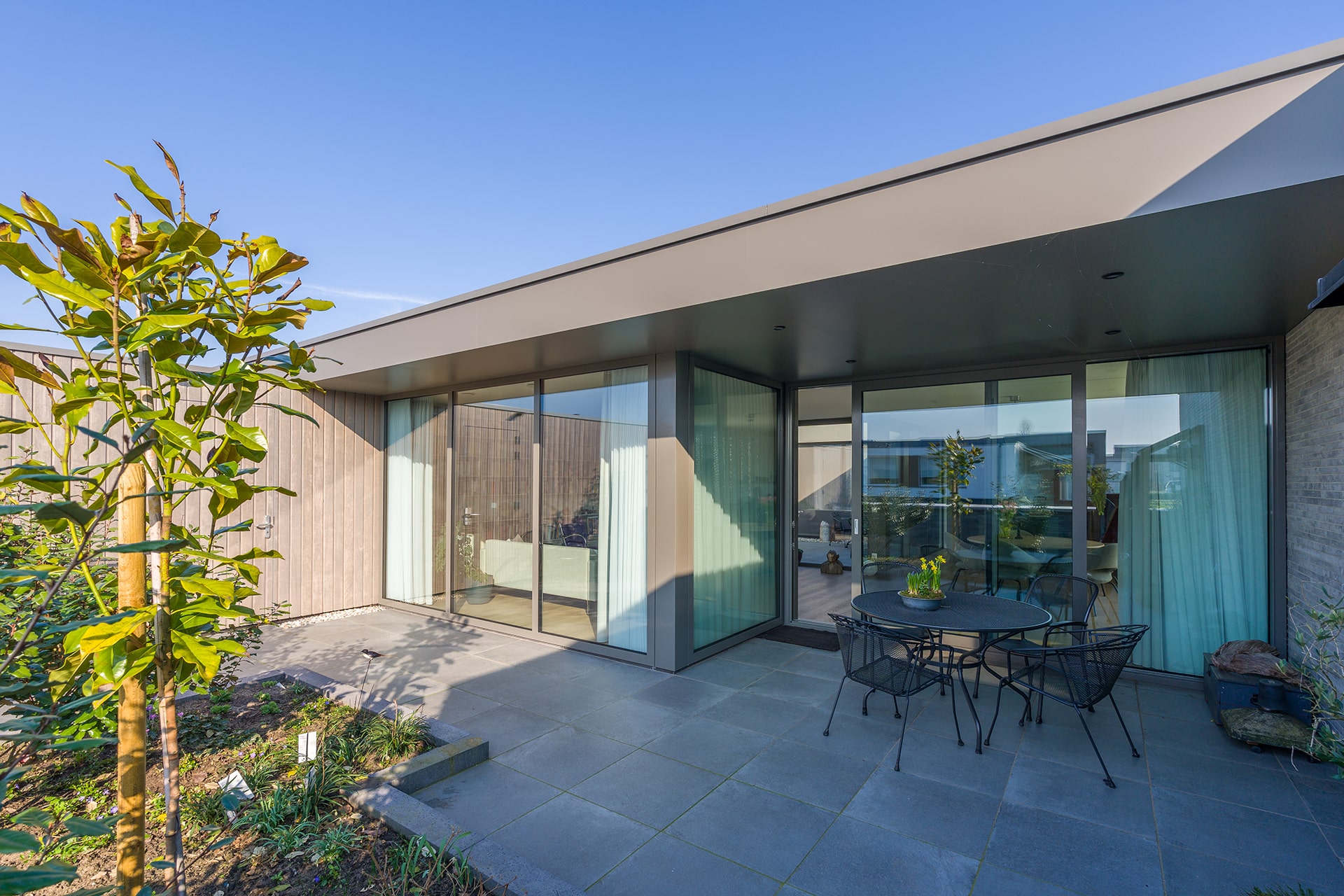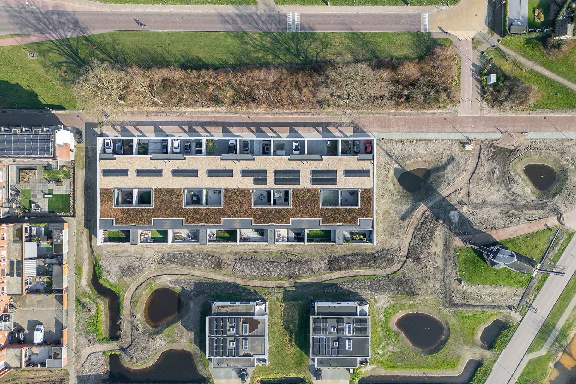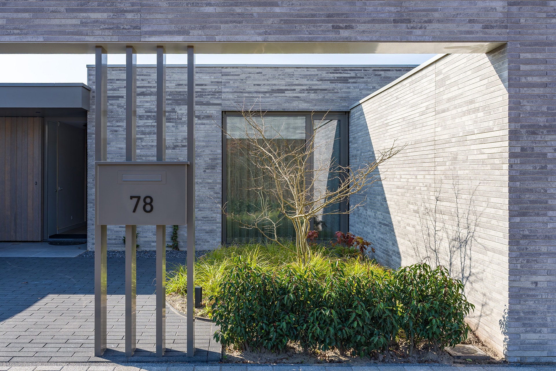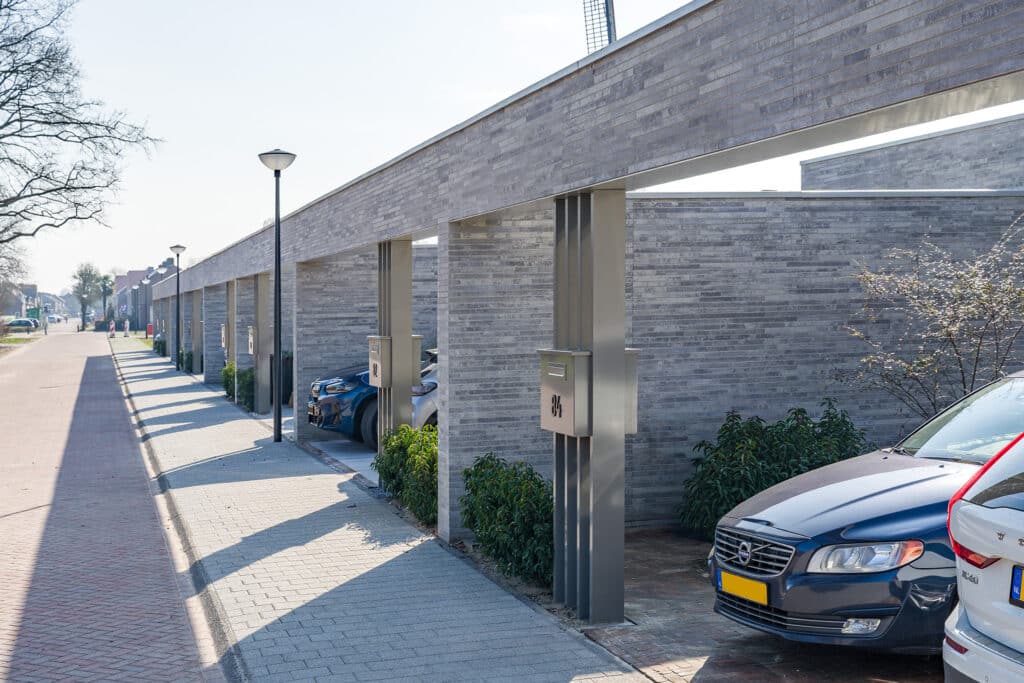 De acht identieke bungalows liggen aan elkaar geschakeld binnen één bouwmassa. In deze massa zijn diverse uitsneden gemaakt waardoor er verschillende buitenruimten ontstaan. Aan de voorzijde ontstaat zo een voortuin met ruimte voor o.a. twee auto’s. Centraal in het midden is een patio gesitueerd die diverse ruimten van daglicht voorzien. En aan de achterzijde ligt een achtertuin die over de volle breedte uitzicht geeft op het groen. Doormiddel van de gemetselde tuinmuren ontstaat er een duidelijke afbakening van de bebouwing en het omliggende groen. Deze alzijdigheid zorgt voor een heldere en strakke uitstraling waarbij dus alle gevels aandacht hebben gekregen. Er kan nu ook geen sprake zijn van een individuele eigenaar die een andere erfscheiding realiseert. Deze uniformiteit wordt versterkt door het gebruik van één langformaat gevelsteen waaruit zowel de gevels als de tuinmuren zijn uitgevoerd. De bewuste lichte kleurstelling zorgt niet alleen voor meer licht in het interieur, maar contrasteert ook mooi met het groen. De verticaal geplaatste houten gevelplanken geven de woning een extra warme uitstraling.