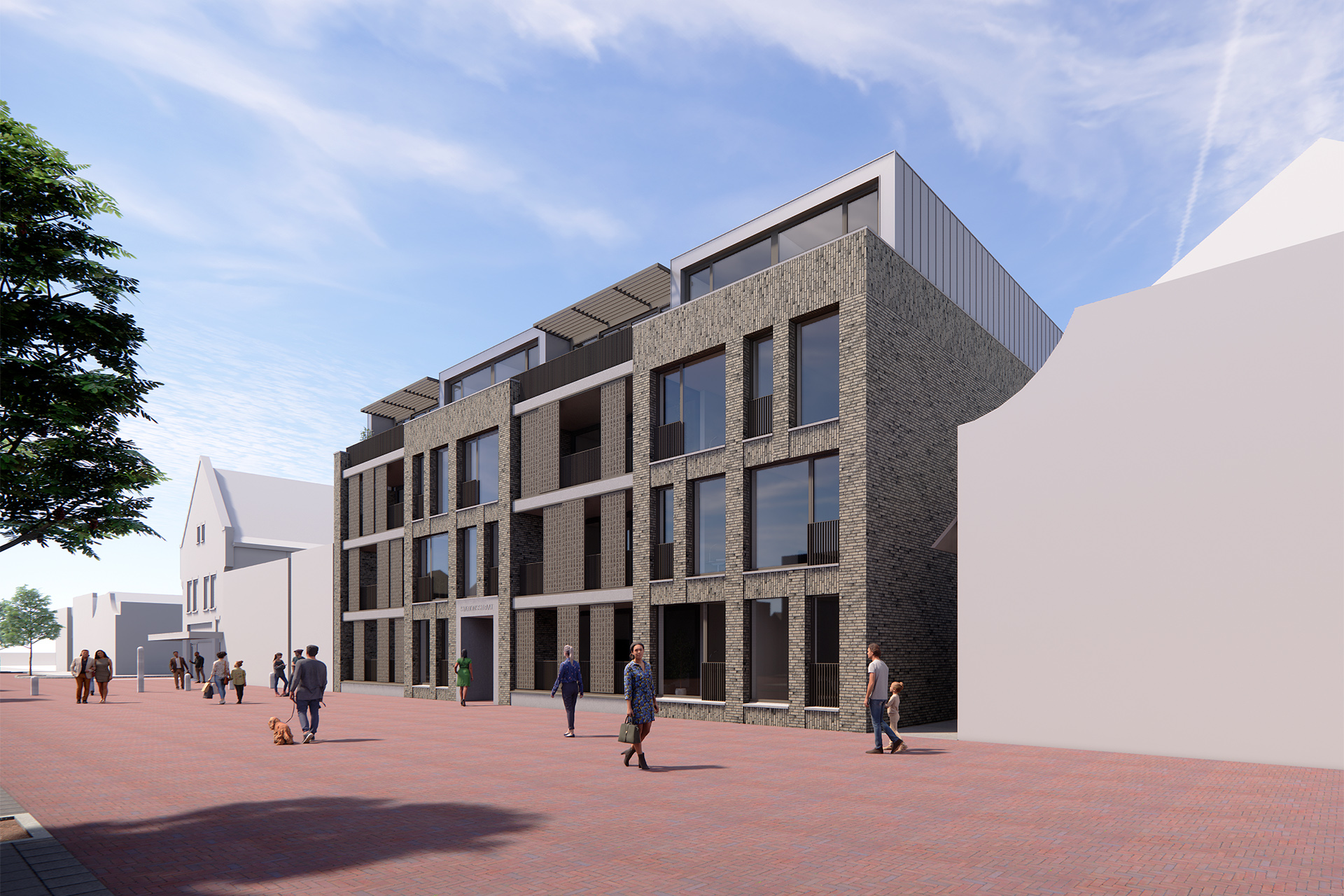 Een gebouw met ook een bijzondere uitstraling. Ter plaatse van de woonkamer zijn over de volle breedte balkons opgenomen. Door de balkons te voorzien van decoratieve schermen met uitgestanste letters waarvan de teksten in samenwerking met een kunstenaar tot stand zullen komen. De schermen zijn naar behoefte te verplaatsen en zorgen voor zonwering en/of privacy. Dit zorgt voor een dynamisch en wisselend gevelbeeld. Ter plaatse van de slaapkamers is de gevel iets meer gesloten en voorzien van versprongen verticaal en horizontaal geplaatste metselwerk banden. Deze zorgen voor een plastiek en levendige gevel. Doordat de gevel vooral ook vanaf de zijkant wordt gekeken door het langslopende publiek verandert het aangezicht constant. De bovenste verdieping is terugliggend uitgevoerd in een licht metaal. Deze gaat mooi over in de lucht en komt zo minder zwaar over. Horizontale aluminiumlamellen zorgen voor de benodigde zonwering en voorkomt de plaatsing van minder fraaie parasols.