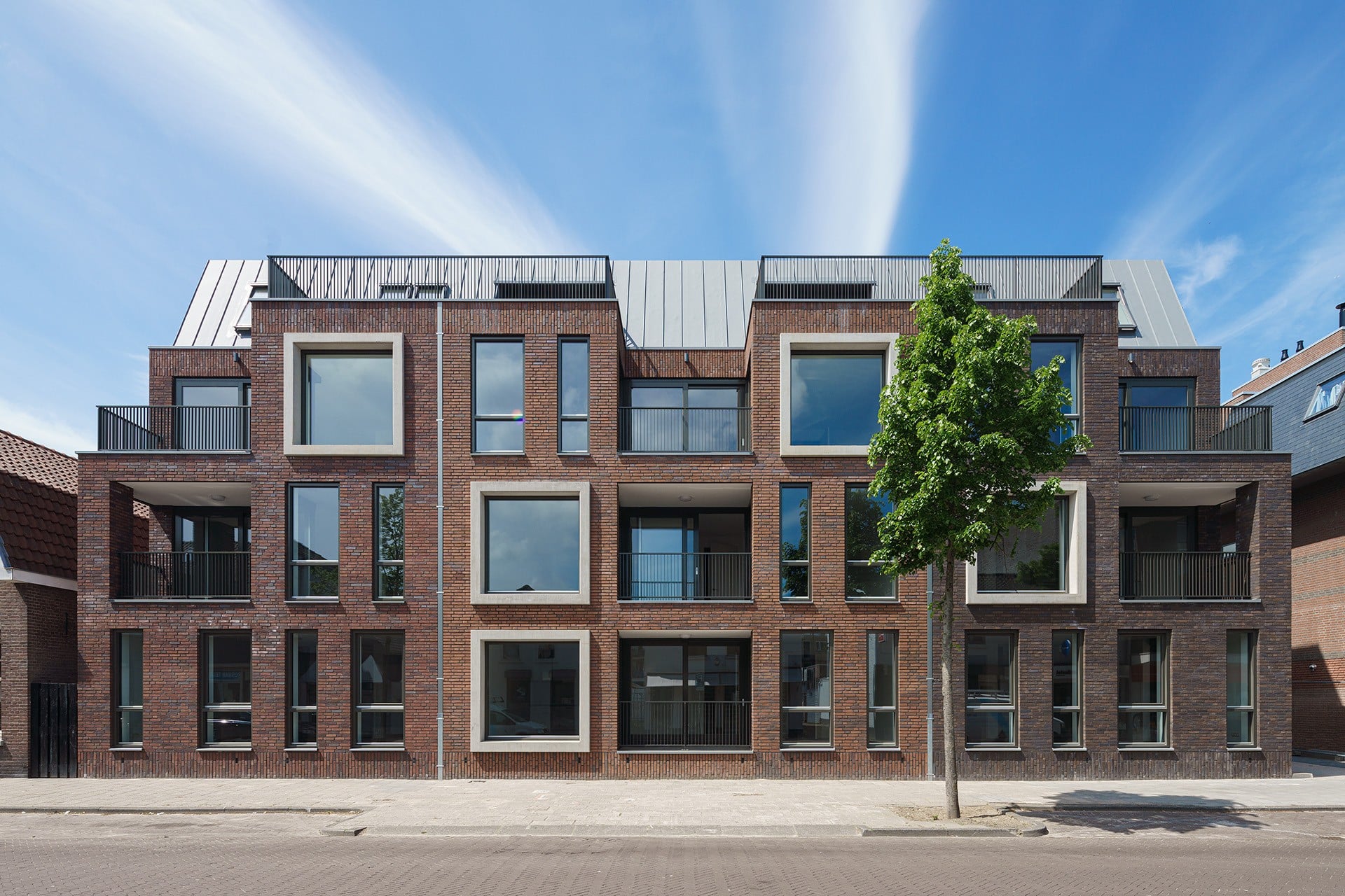 Het speelse gevelbeeld van diepliggende loggia's, inspringende dakterrassen en uitstekende kaders zorgt voor een vriendelijk inpassing in het bestaande straatbeeld.