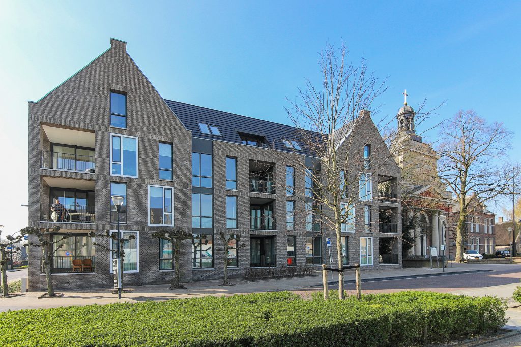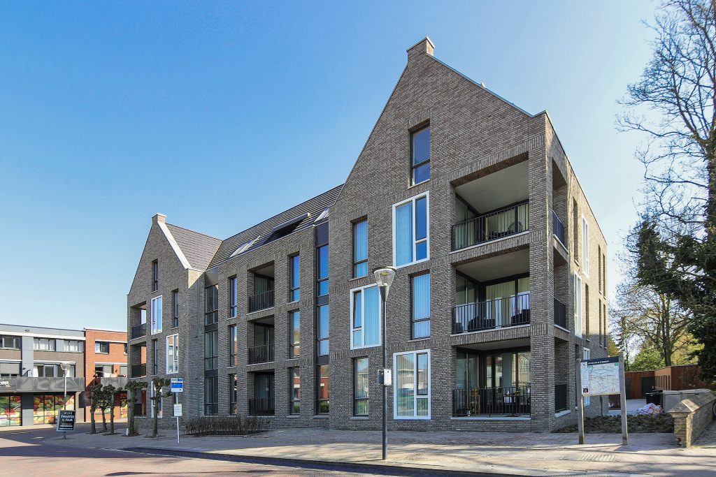 Het gebouw bestaat uit 4 lagen en een kap, waarbij er op de eerste 3 lagen elk 4 appartementen zijn gesitueerd en op de bovenste verdieping 3 appartementen wat resulteert in 15 appartementen. Het gebouw ligt als L-vorm aan het Dorpsplein en de Schoolstraat met in de oksel het trappenhuis en entree met daarachter het parkeerterrein met bergingen. De gevel vanaf de Schoutstraat mag niet als achtergevel gezien worden het is immers eveneens een prominente zichthoek. Door de gevel aan de Schoolstraat door te trekken worden ook de parkeerplaatsen visueel wat afschermt en is er vanuit de Schoutstraat niet direct zicht op de achtergevel. Om inkijk te voorkomen bij de buren op nummer 4 is deze gevel namelijk meer gesloten. De gevel op de hoek van de Schoutstraat kan dus als prominente gevel worden vormgeven zonder dat nr. 4 daar last van heeft. Ook blijft het zicht op de kerk gehandhaafd, omdat het gebouw stopt voor het verlengde van de Schoutstraat.