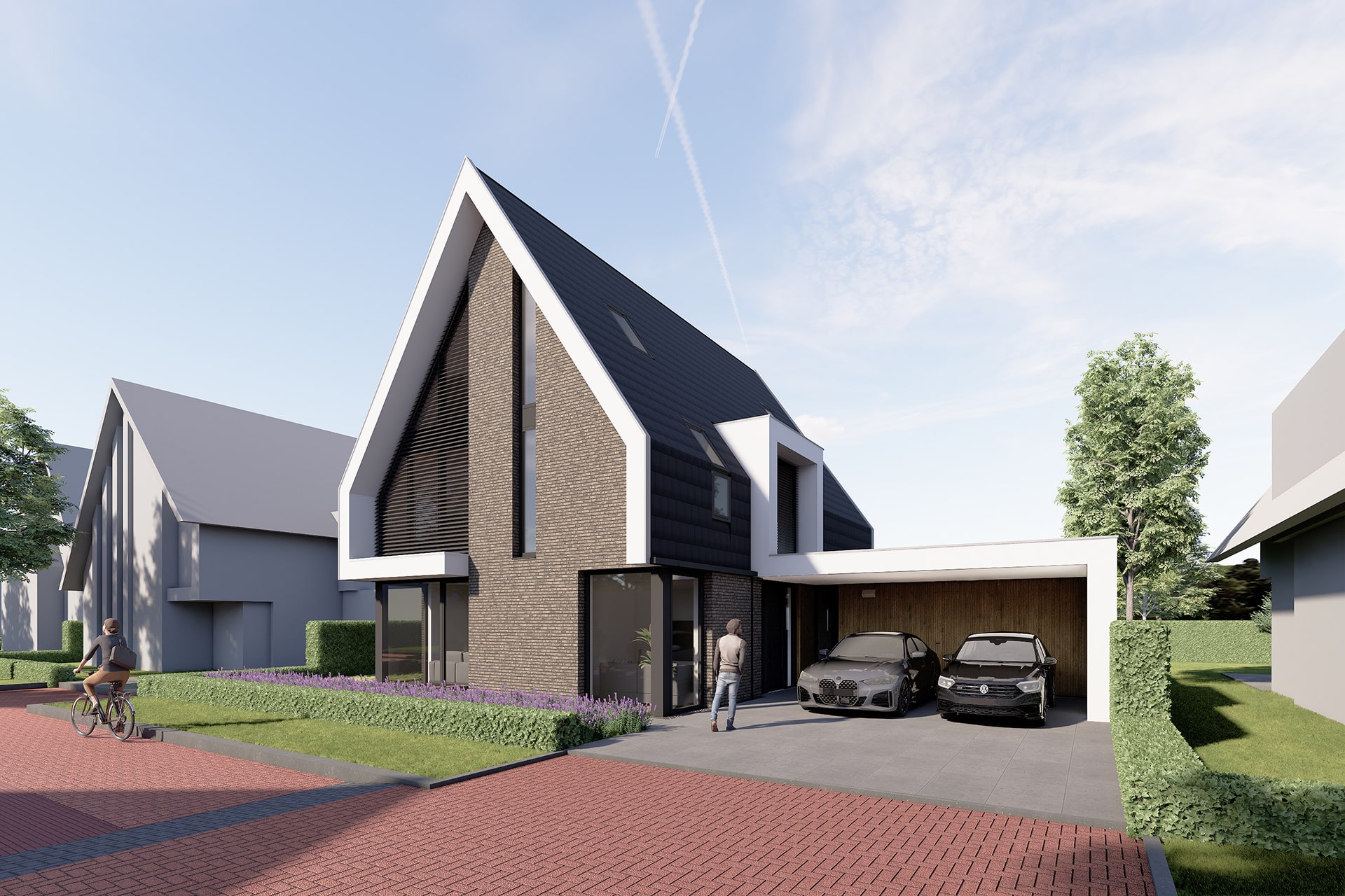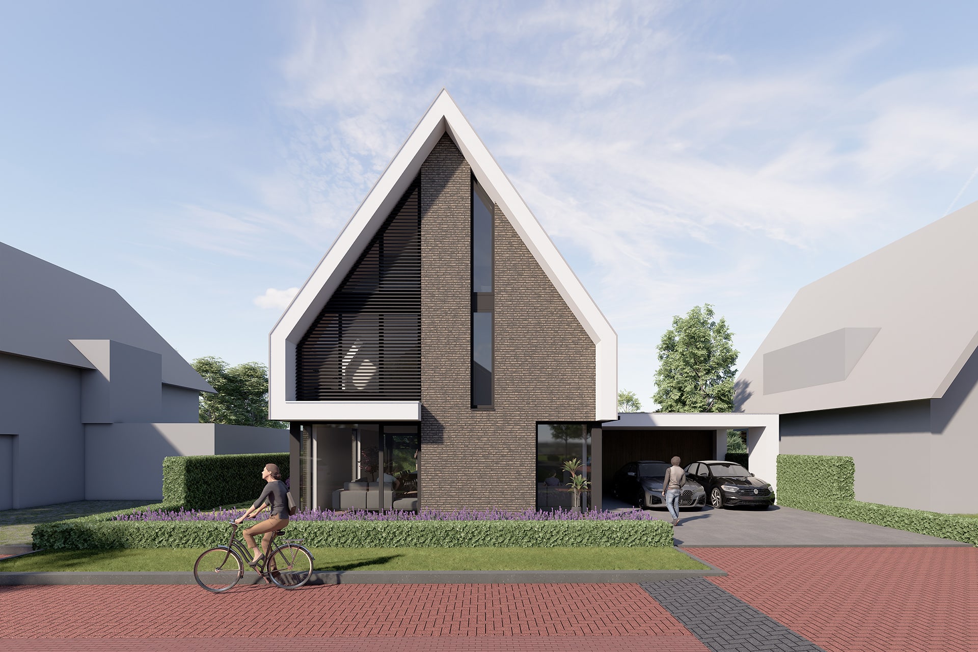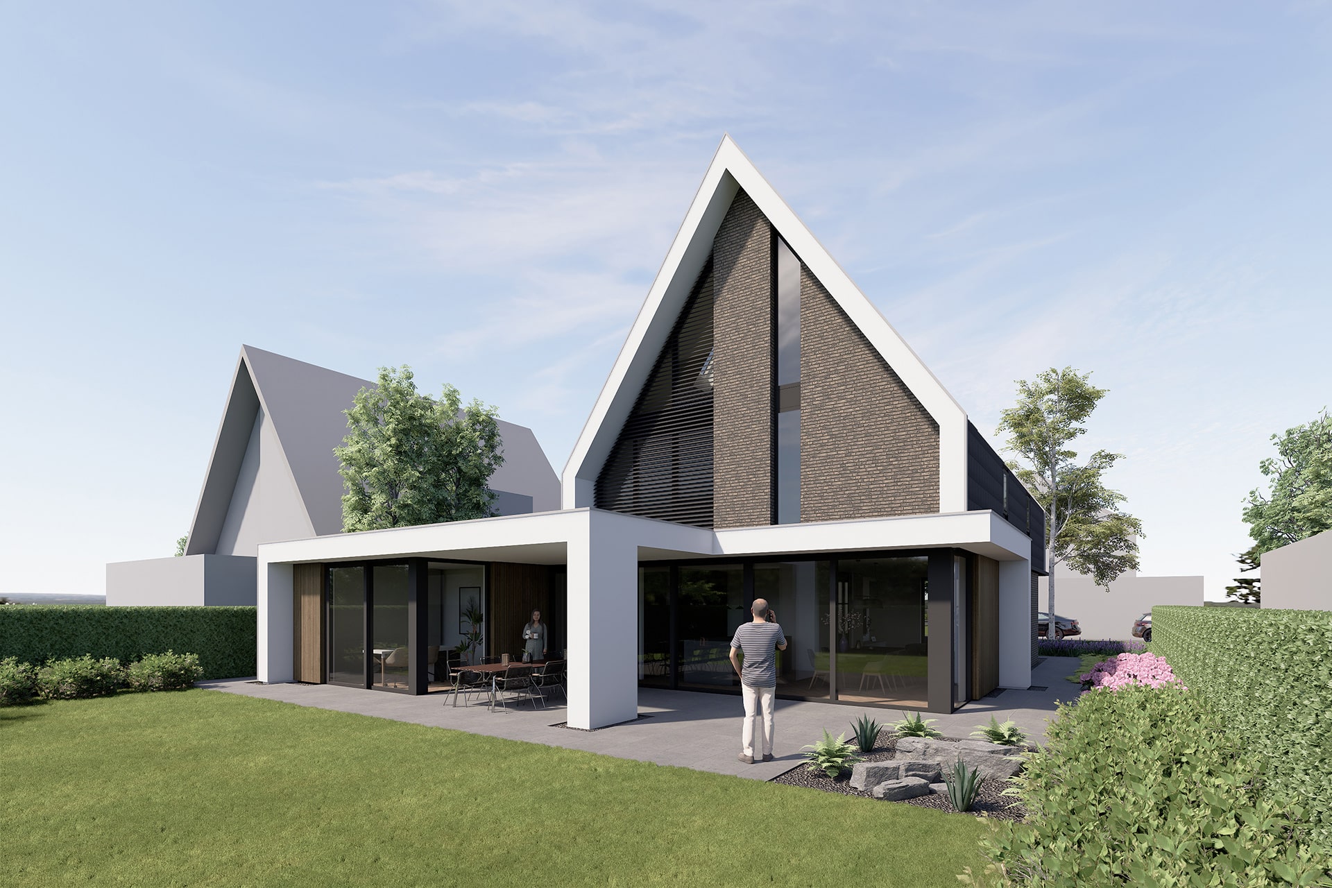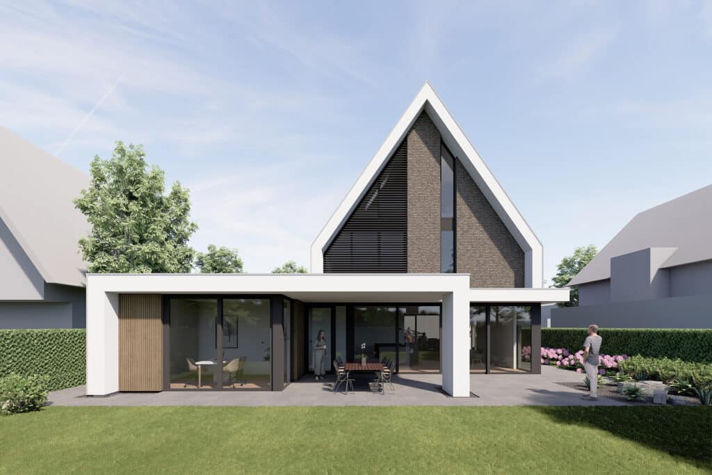 De dakconstructie, donkere bouwstenen, de witte omkadering, de lamellen en houten details maken deze villa tot een uniek ontwerp.